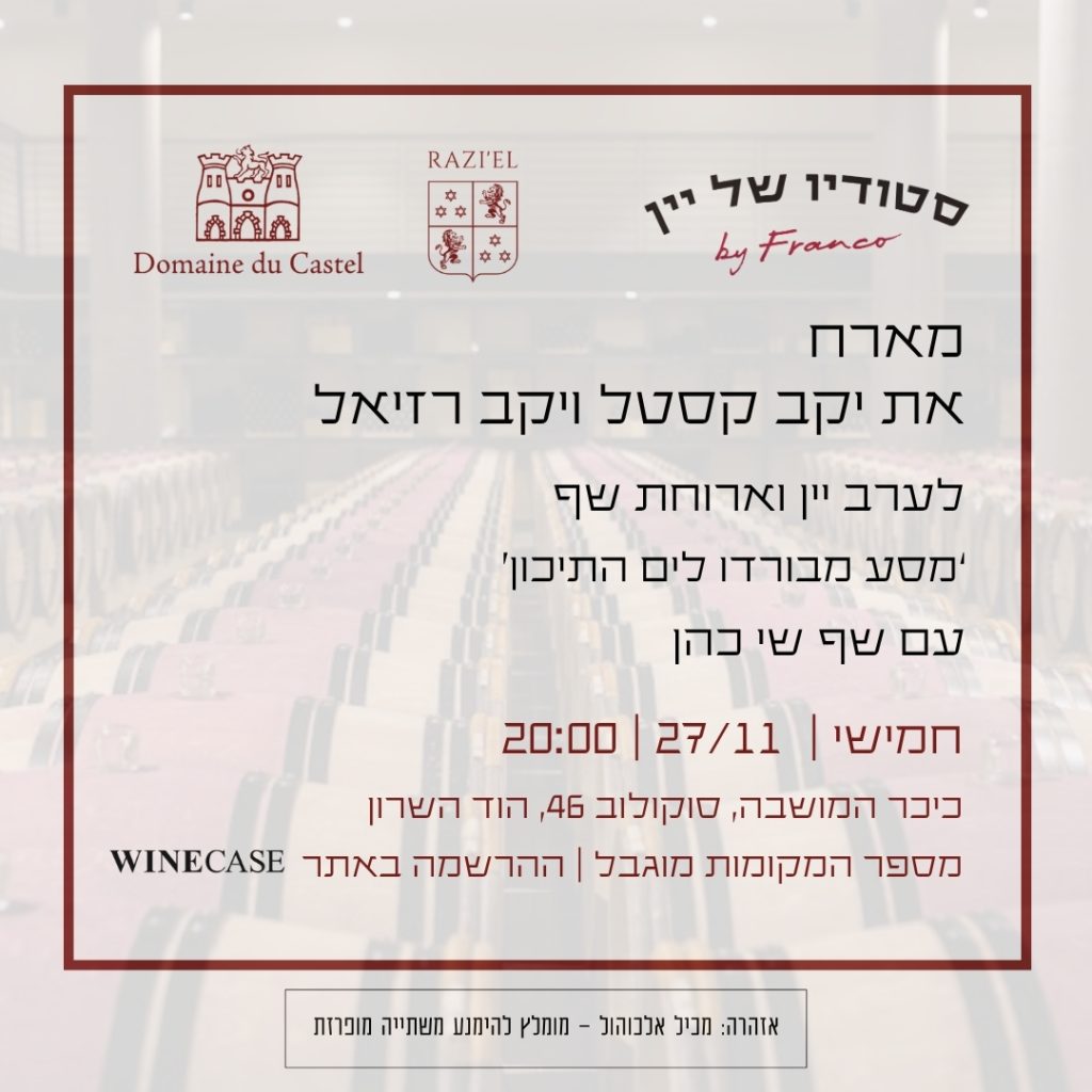 חוויה קולינרית־ייננית, באווירה אינטימית של סטודיו של יין, עם מוזיקה, אווירה ויינות נבחרים של יקב קסטל ויקב רזיאל הנפלאים.